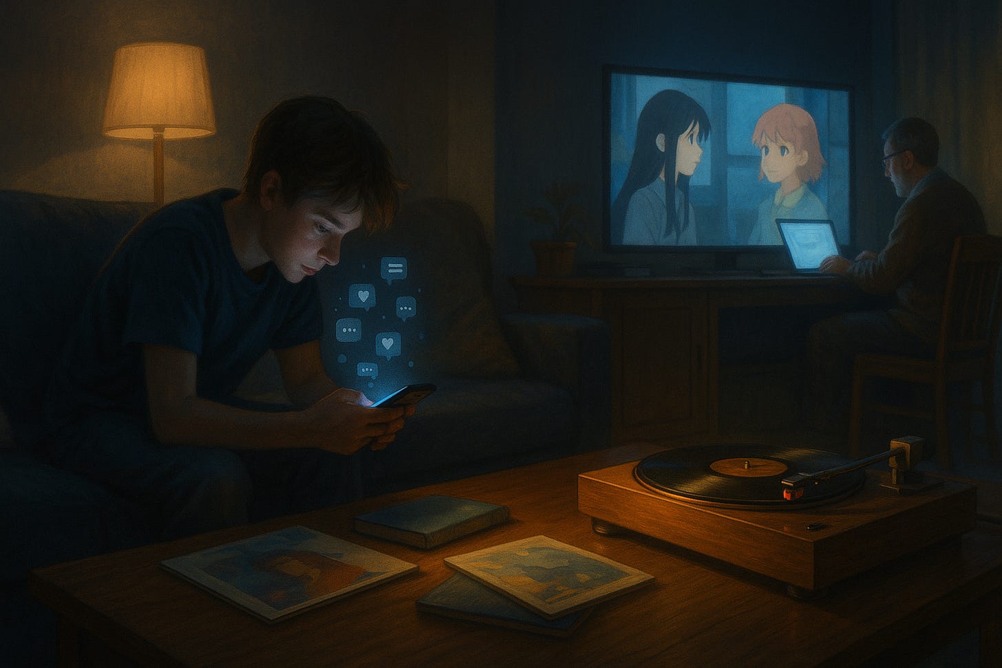 Friday night. A teenager scrolls through short videos while an anime series plays in the background. A parent at the same table flips a new vinyl record, phone open to messages, laptop open to email. Three screens, one record, one family, many channels fighting for attention.