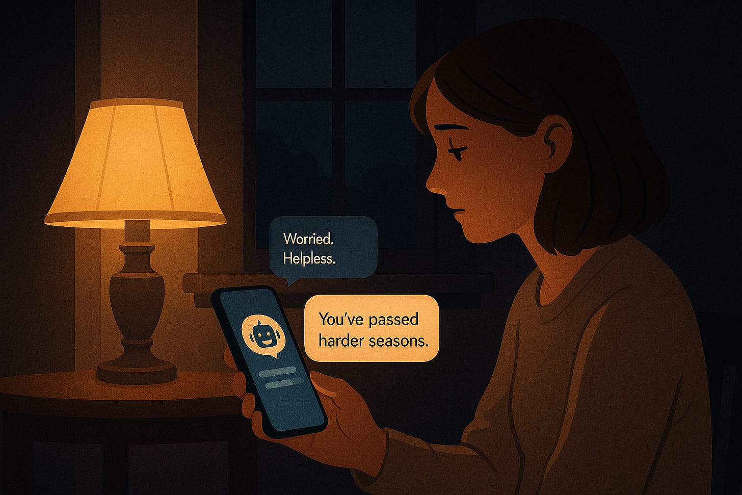 AI promises presence. Therapy bots, check-ins, and conversational agents fill the silence—but also blur the line between support and substitution.