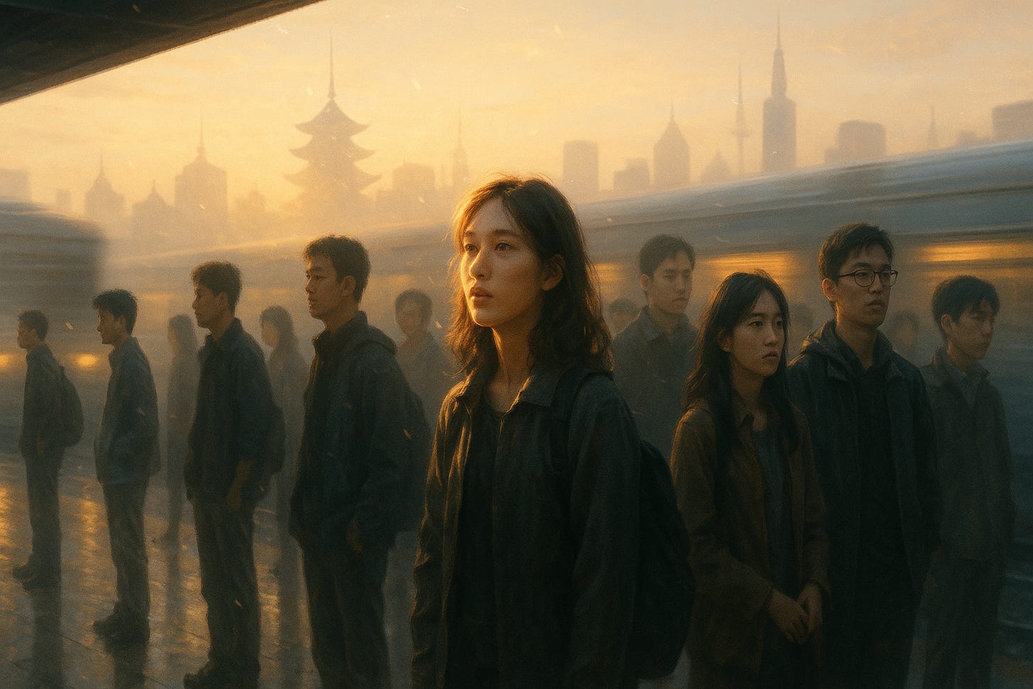 Just before dawn, a train platform in an Asian megacity slowly fills with young adults. Backpacks. Coffee cups. Sleep-stung eyes. The LED boards above glow with familiar promises: Opportunity. Reform. Future. The air is thick with anticipation but also with something quieter—a complex, almost sacred ache.