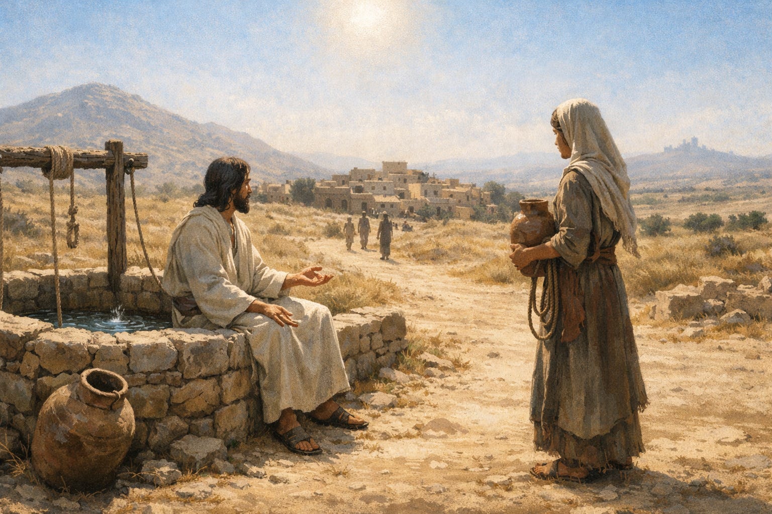 It is “about noon” (the sixth hour). In the Mediterranean world, that matters. Noon is not the hour of pleasant errands; it is the hour of exposure—heat, glare, and minimum cover. John is already shaping the symbolism: this encounter happens in full light. Whatever is hidden will not remain hidden. Whatever is thirsty will name its thirst.